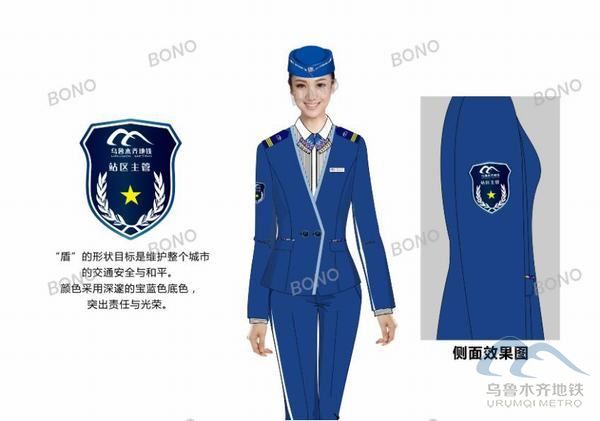 乌鲁木齐地铁职业服装设计结合地铁行业和乌鲁木齐特有的地域文化特点,将新疆民族特色的艾德莱丝绸花型融入到制服设计理念中,款式设计及面料选择上考虑了轨道交通行业的特定需求及新疆的气候条件。男士西服套装为藏蓝色,与领带、帽子、颜色一致,搭配得体,亲和力十足。女士西服为天蓝色,活力十足,清新自然,艾德莱斯绸元素的领花和帽子细节相互呼应,体现新疆特色的同时,显示出女性的婉约。运营时市民将感受到身着制服、青春率性的“儿子娃娃”和“丫头子”热情周到的服务。